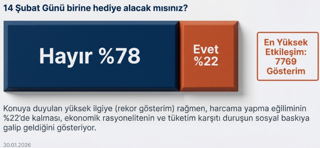 14 Şubat Günü birine hediye alacak mısınız? diye sordum. %78 Hayır cevabı aldım. Toplum kapitalizme karşı duruşunu göstermiştir. En yüksek gösterim alan anket sorum, bilincin ne kadar yüksek olduğunu gösterdi.