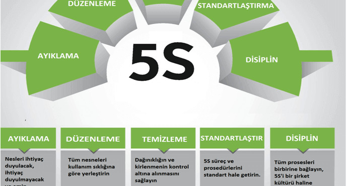 Japonya’da 1960’lı yıllarda uygulanmaya başlayan 5S kuralı “Yaşam Boyu İş” anlayışına dayanır. Kaliteli ve güvenli bir çalışma ortamı kurmayı ve bu ortamın devamlılığını sağlayarak hata ve kaza oranının %0’a düşürmeyi hedefleyen bu prensip, çalışan memnuniyeti ve verimi maksimum seviyeye ulaştırmak koşulu ile maksimum iş disiplini ve sonucunda kaçınılmaz başarıyı hedeflemektedir.
