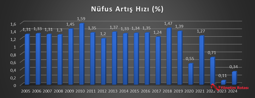 Yukarıdaki grafikten göreceğiniz üzere nüfus artış oranının 2019 yılından itibaren bir düşüş trendine girdiğini ve özellikle 2019-2025 yılında başta pandemi, yanlış ekonomi politikaları ve 2023 yılında siyasi bir hareket olarak yorumlanan EYT düzenlemesi ile çalışma ve sosyal güvenlik hayatı için tehlike çanları çaldığını söyleyebiliriz.