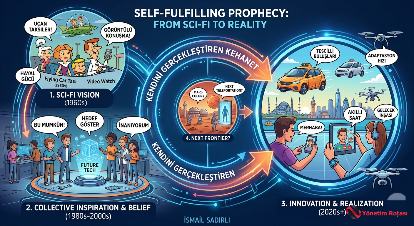 Çocukluğumuzun pazar sabahlarında, ekran karşısında büyülenerek izlediğimiz o uçan arabalar, görüntülü konuşma yapan kol saatleri ve her işe koşan robot hizmetçiler, o günlerde sadece birer “hayal ürünü” olarak nitelendiriliyordu. Ancak bugün, o sahnelerin içinde yaşıyoruz. Peki, bu bir rastlantı mı, yoksa insanlığın kendi kurguladığı geleceğe doğru yürüdüğü bir Kendini Gerçekleştiren Kehanet (Self-Fulfilling Prophecy) mi?