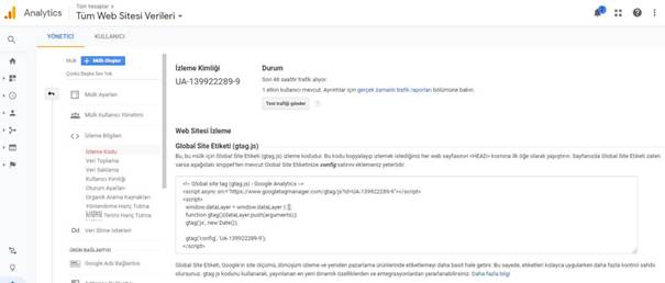 - Bir sonraki yönlendireceğiniz ekran, izleme komut dosyasını alabileceğiniz Google Analytics yönetim sayfasıdır. Bunlar, web sitesi kodunuza eklemeniz gereken kod satırlarıdır: Google Analytics komut dosyası ve UA kodu