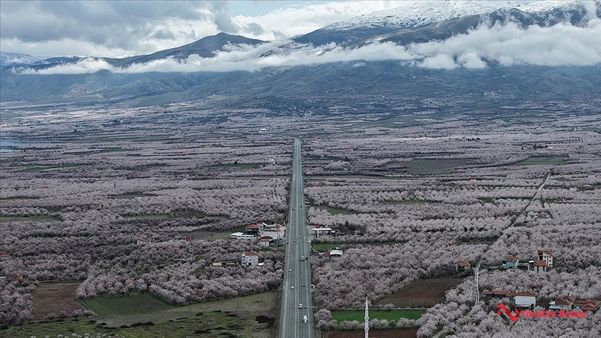 Ova genelinde uzanan kayısı bahçeleri beyaz bir manzara oluştururken, bu alanların içindeki yerleşimler çiçeklerin zarif görüntüsüyle adeta inci dizisiyle çevrelenmiş gibi görünüyor.