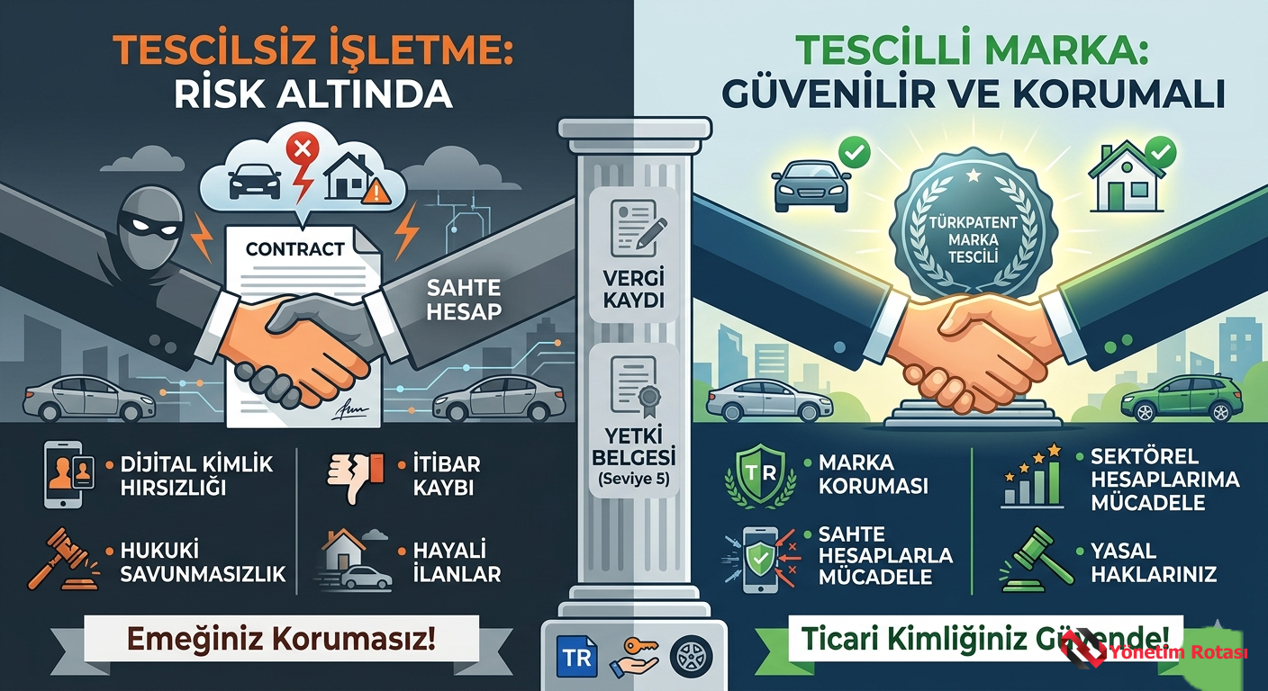 - Dijital Kimlik Hırsızlığı: Yetki belgeniz olabilir ama marka tesciliniz yoksa, bir başkası sizin işletme adınızla sosyal medyada hesap açıp “sahte ilan” girdiğinde yasal olarak eliniz kolunuz bağlanır.